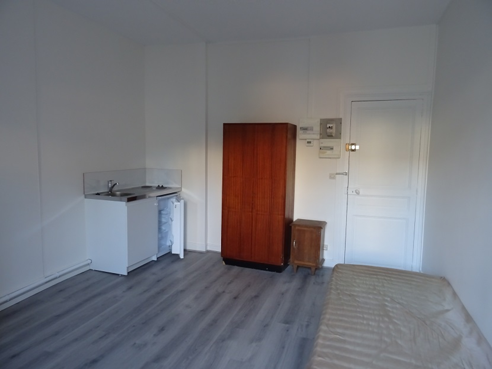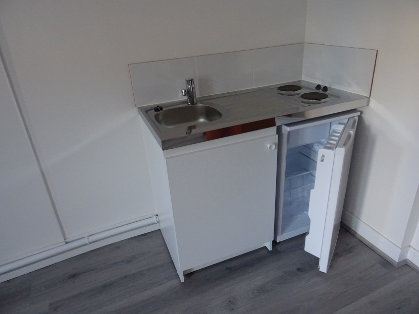 Studio au 2ème étage de 17.20m² habitables comprenant : pièce principale avec coin cuisine (plaque élec + frigo), salle d'eau avec wc (sanibroyeur)