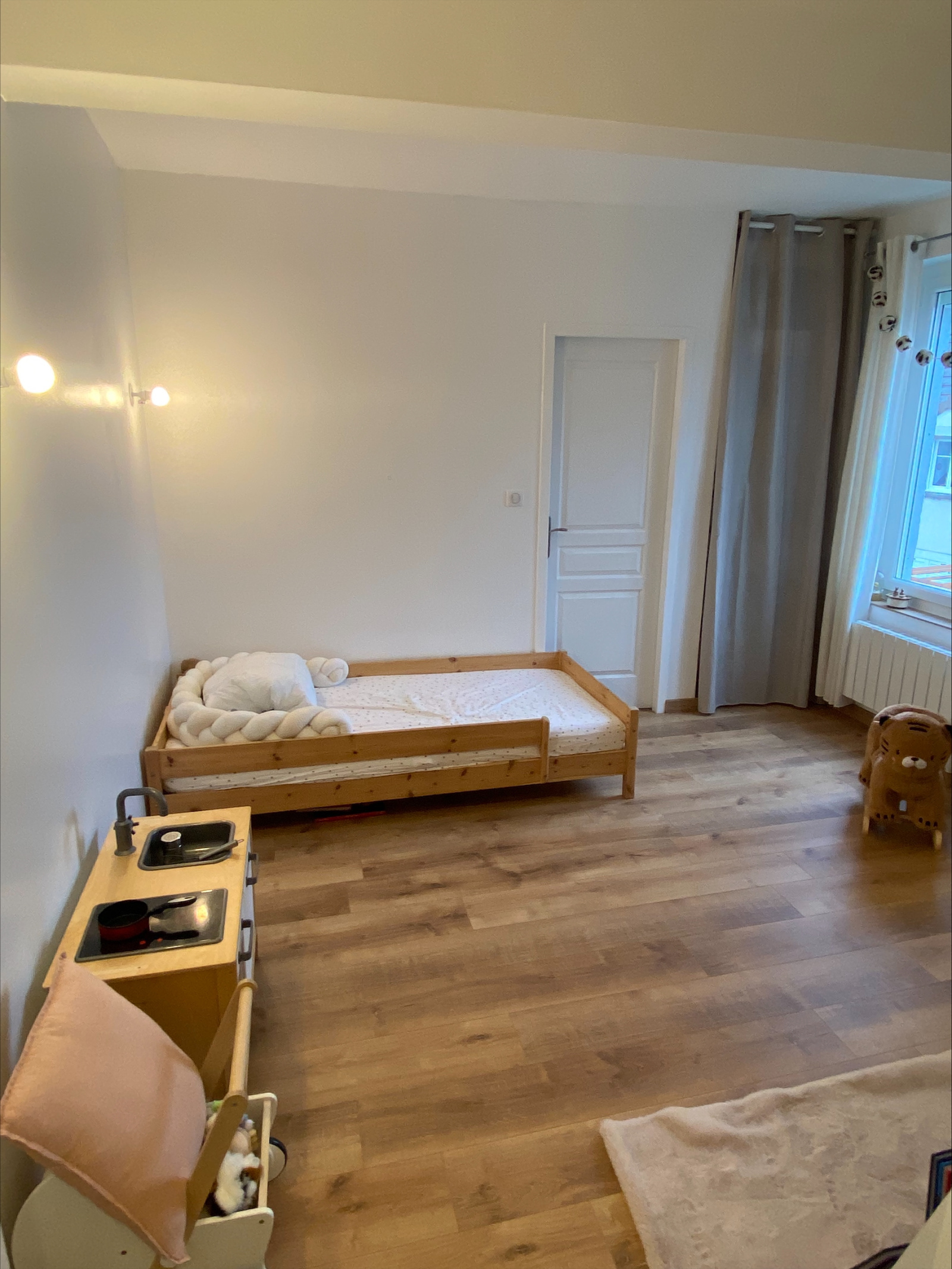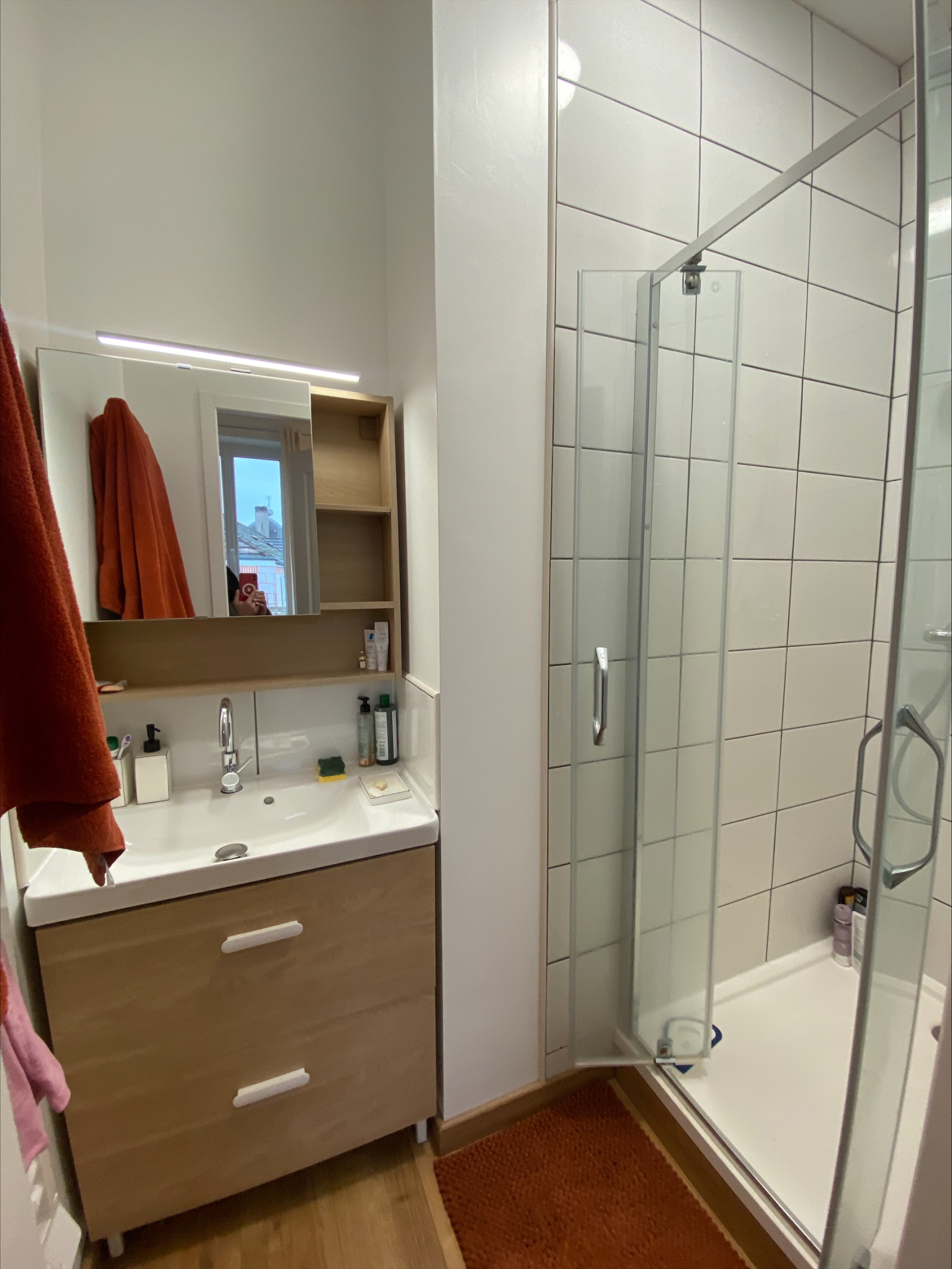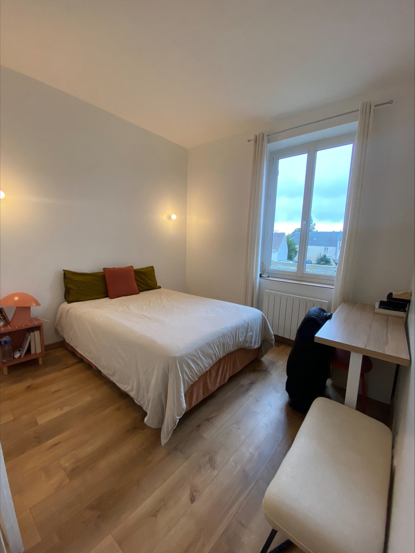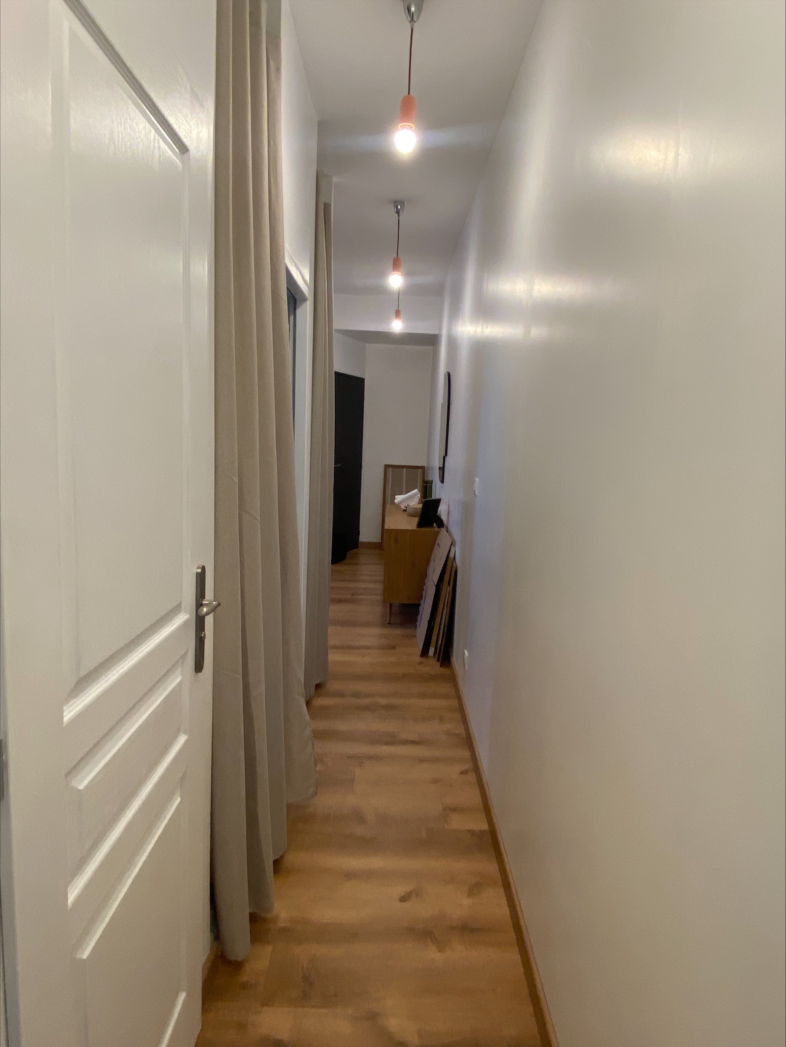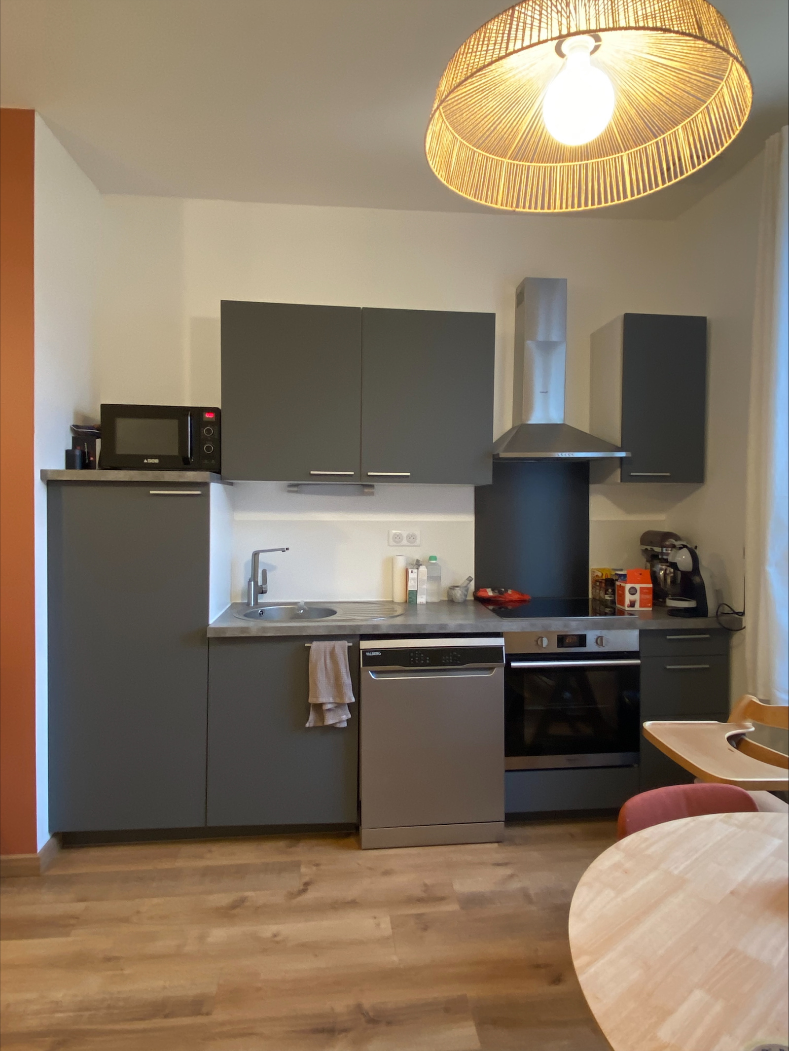 Appartement de type F3 rénové, situé au 1er étage comprenant : séjour-salon avec cuisine ouverte aménagée et en partie équipée (hotte, plaque, four), dégagement, chambre avec salle d'eau privative, chambre avec salle de bains privative, placards, wc.