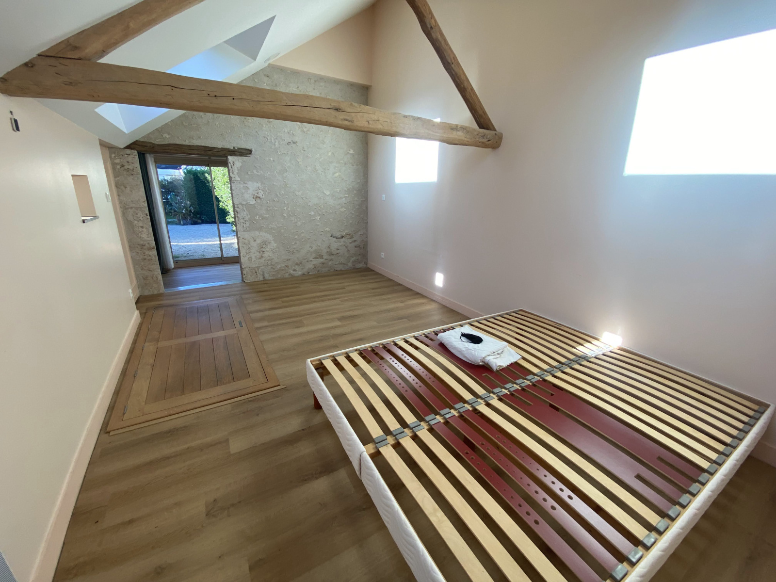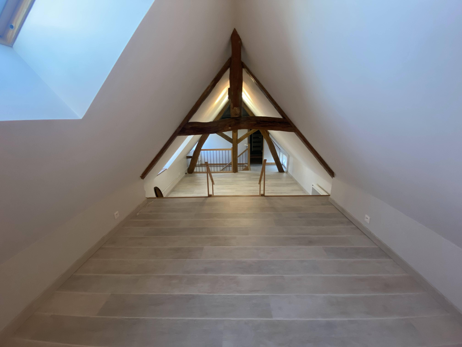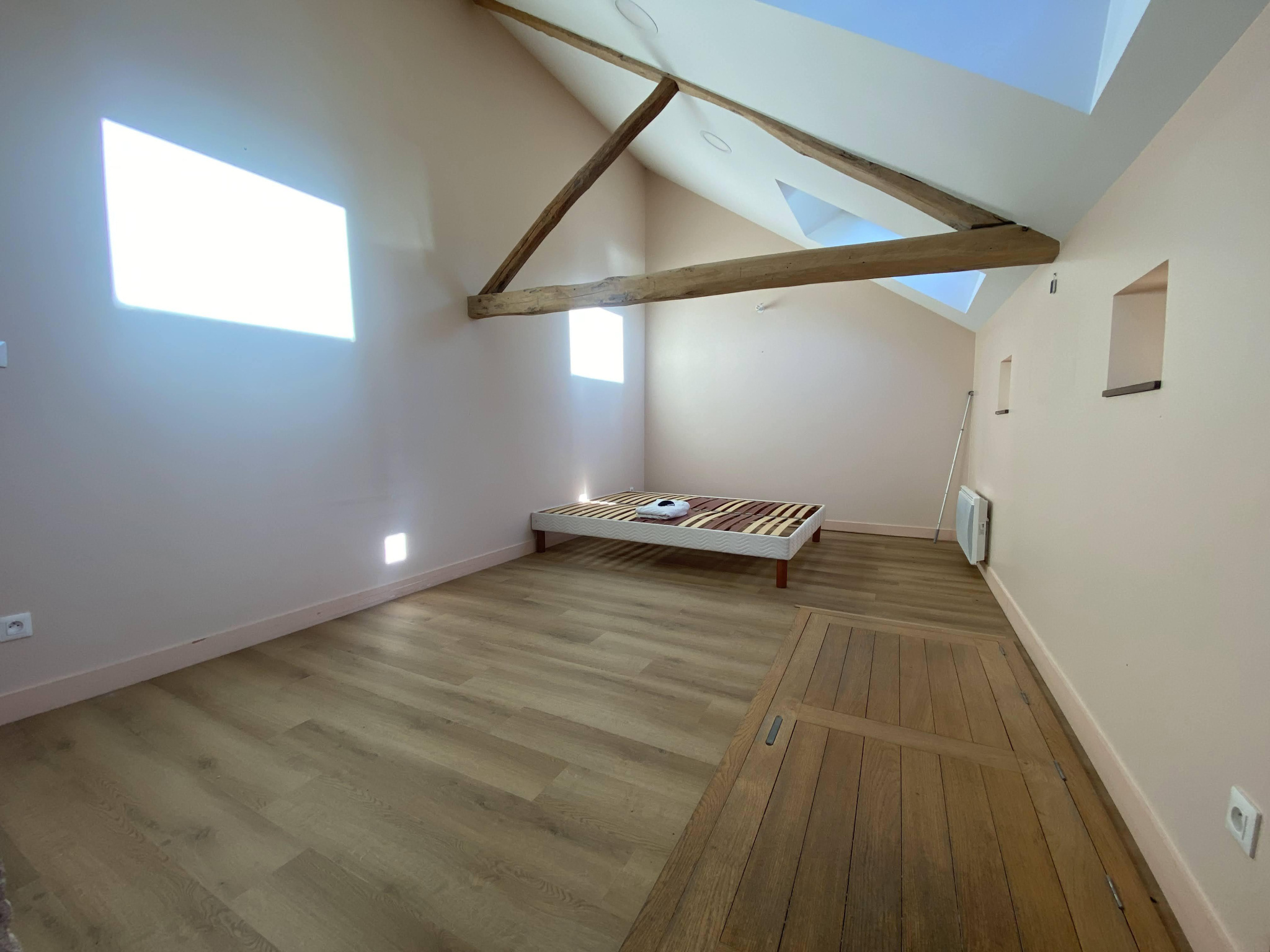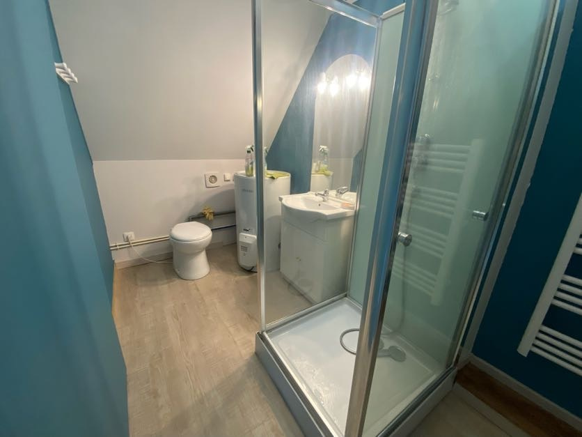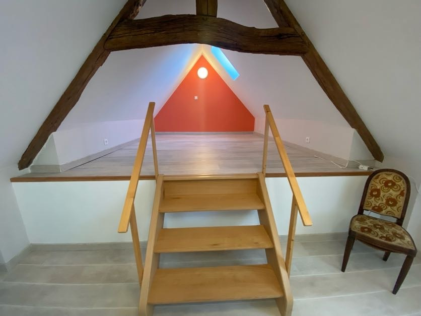 À l’étage, une grande mezzanine offre de multiples possibilités d’aménagement, accompagnée d’une salle d’eau équipée avec WC (sanibroyeur).