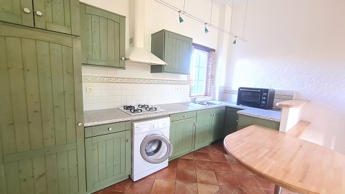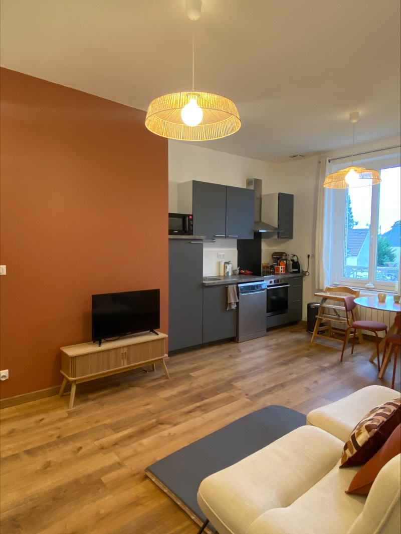 Séjour avec coin cuisine aménagée et équipée.