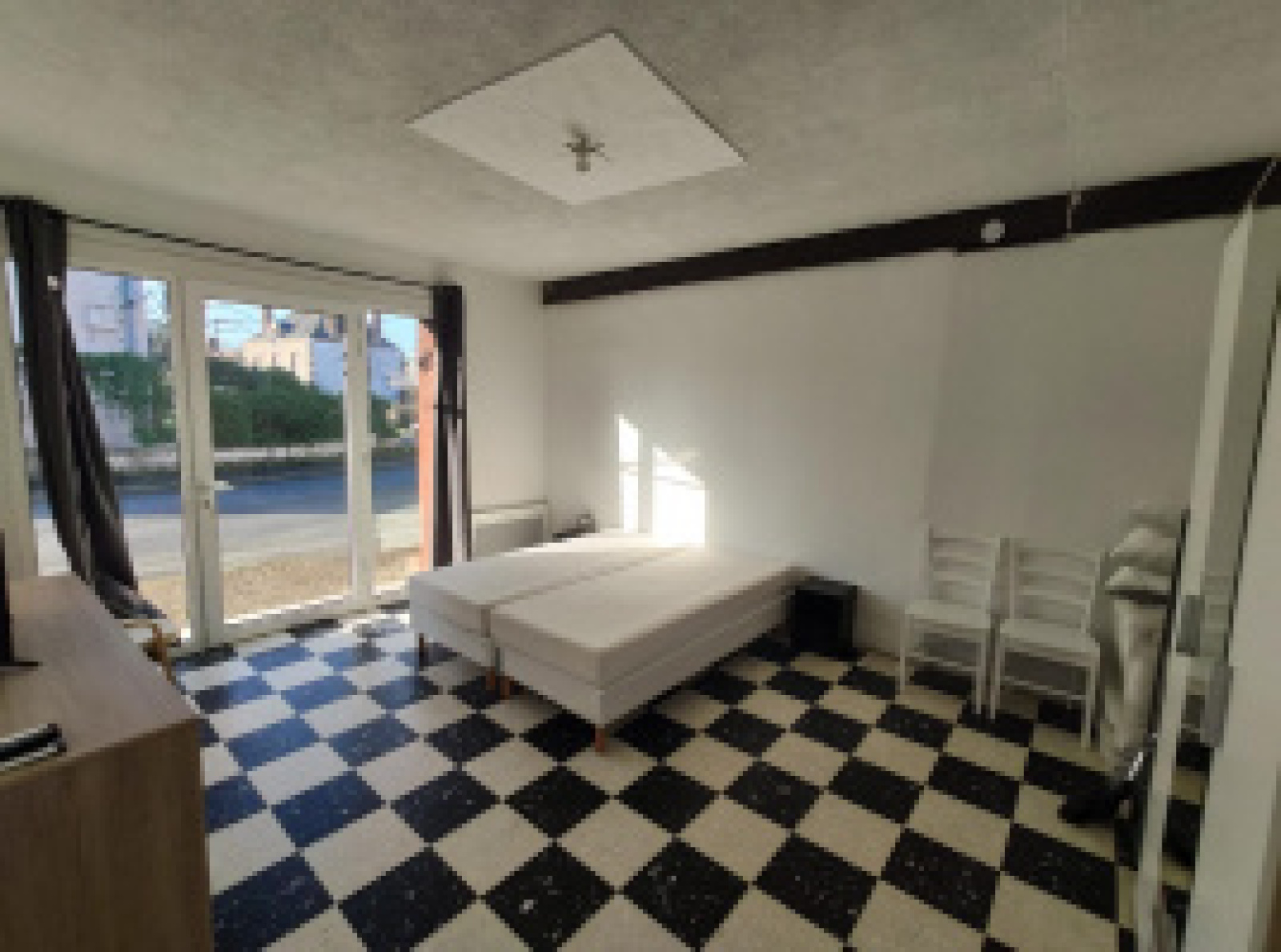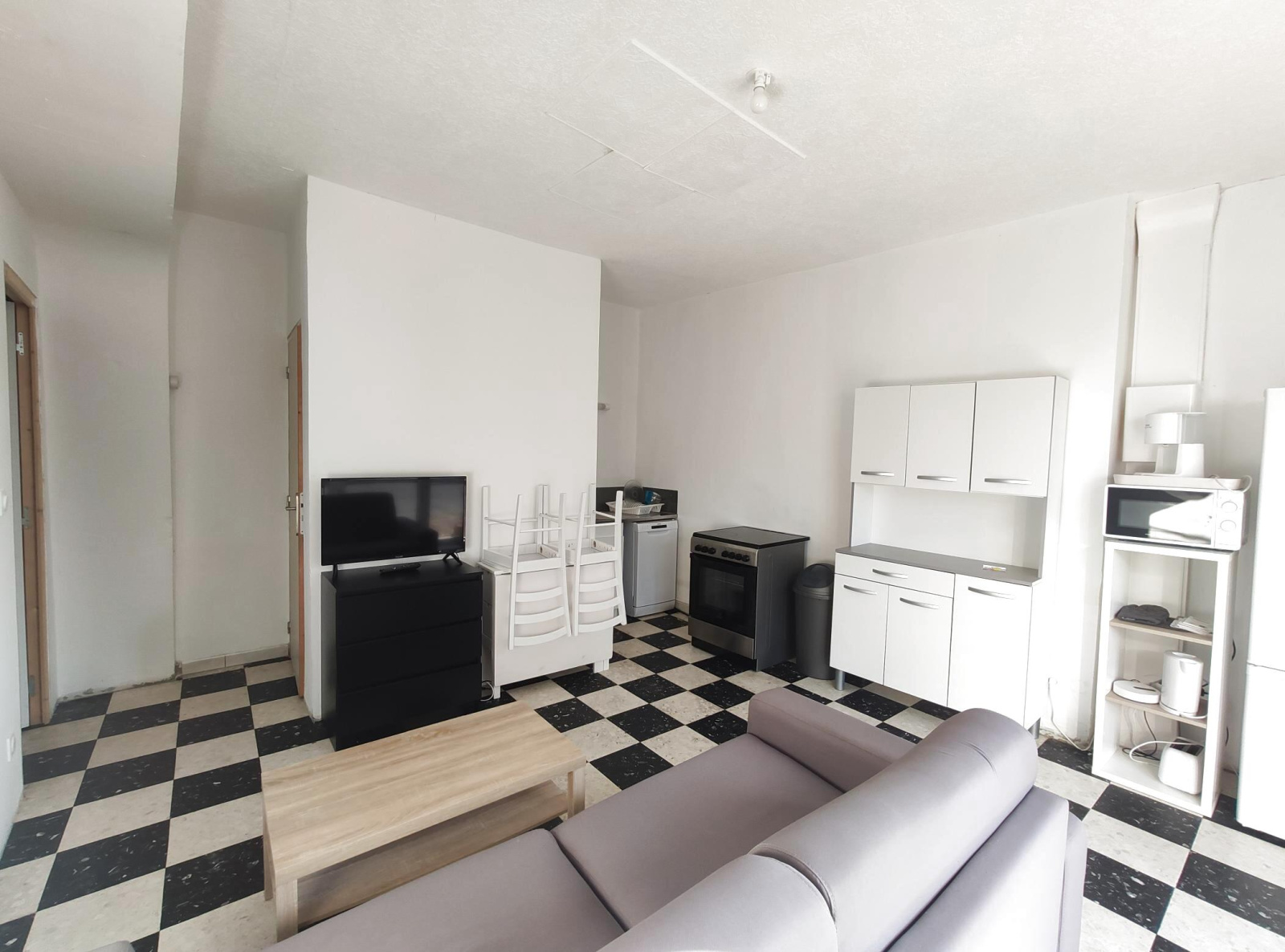 Séjour avec coin cuisine aménagée et équipée, salle de bains avec wc et chambre.