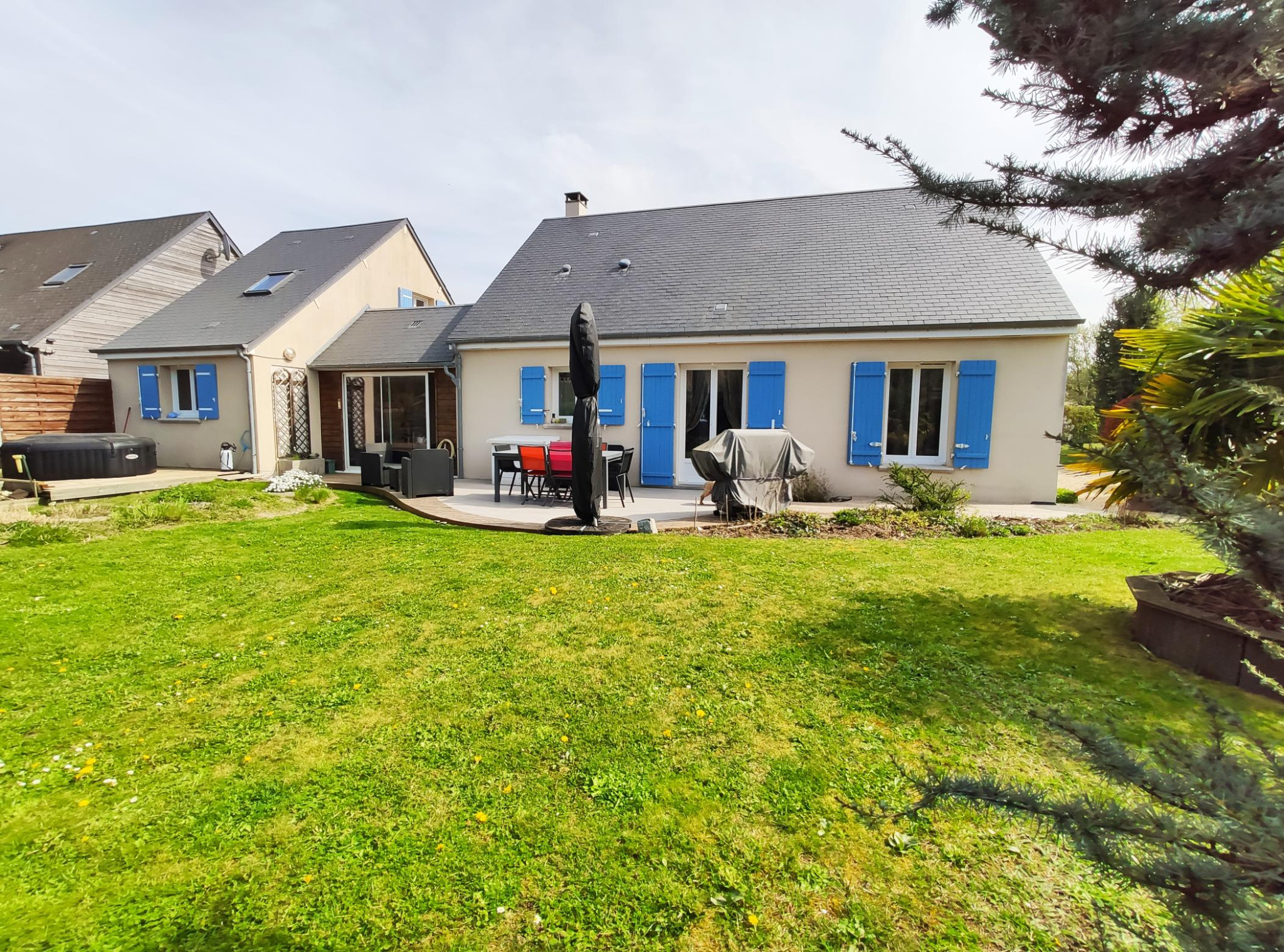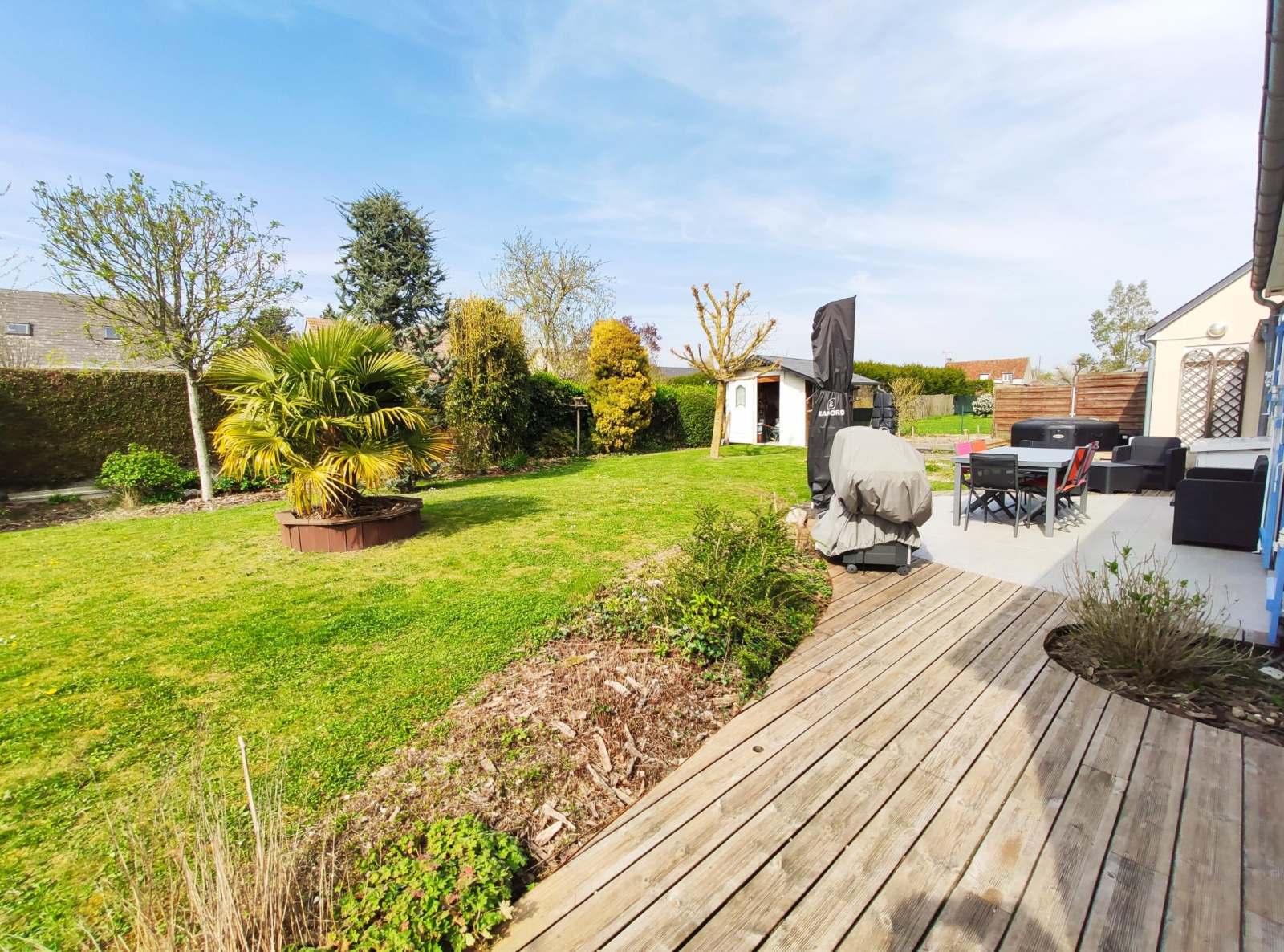 A l'extérieur, vous profiterez d'un agréable jardin avec terrasse en bois, un spa pour les moments de détente ainsi qu'un abri de jardin