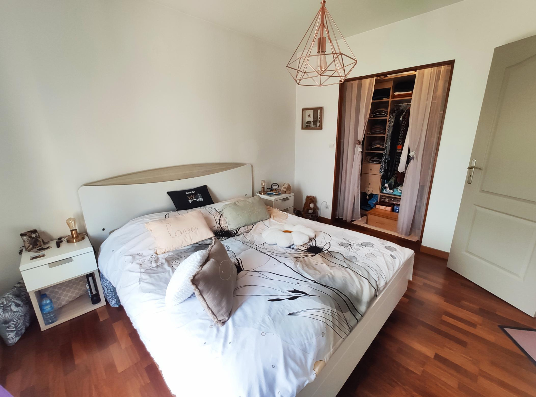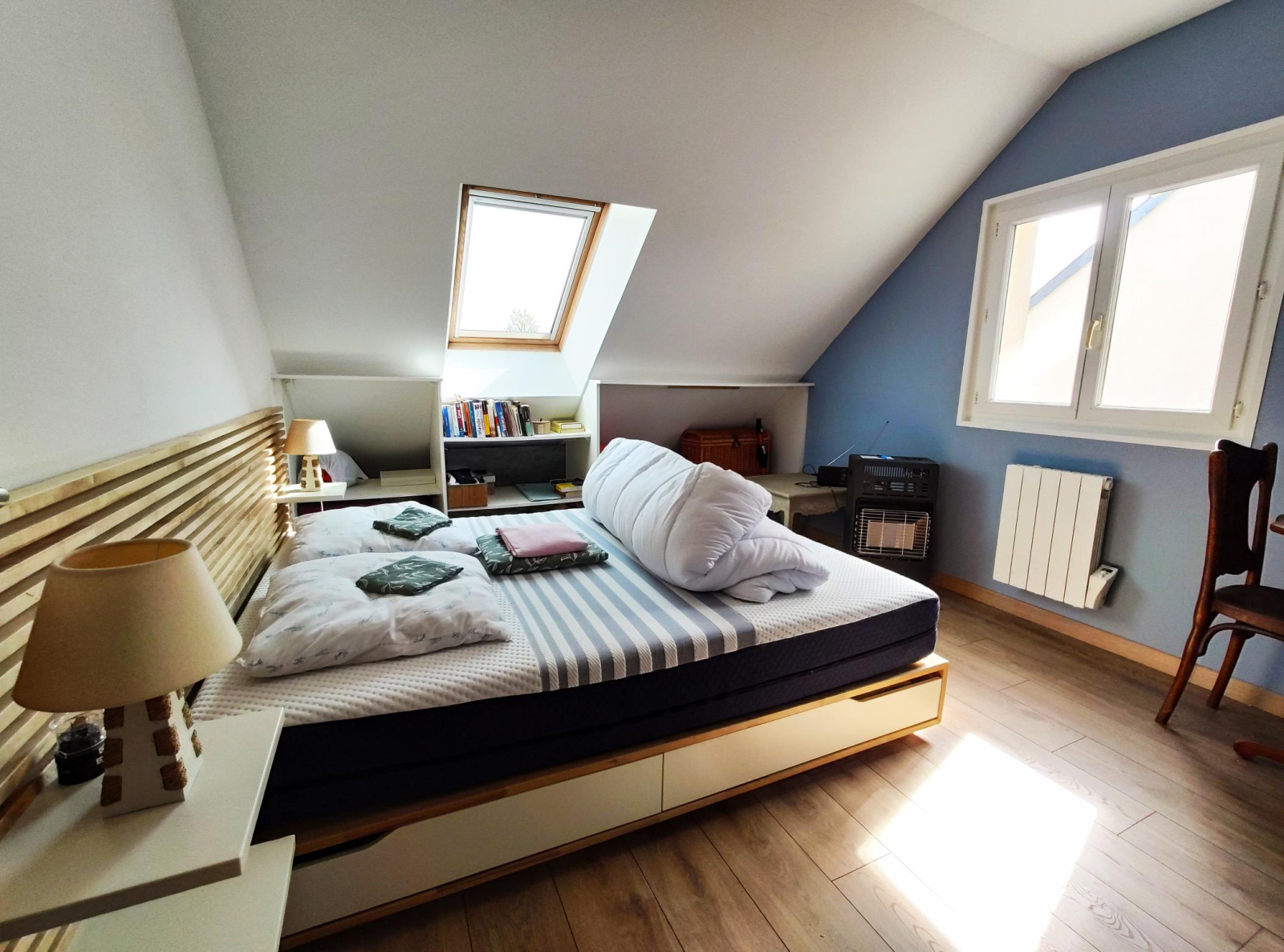 Au rez de chaussée, vous trouverez une pièce de vie d'environ 40m² avec poêle à bois et cuisine entièrement équipée, 2 chambres dont une avec coin dressing, une salle d'eau, un wc et un garage.