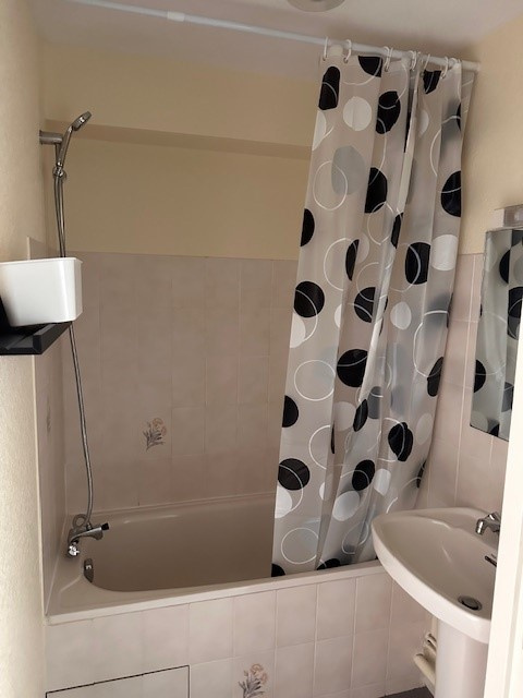 Une entrée avec placard, une salle de bains, un wc séparé, une pièce de vie avec coin kitchentte et balcon.