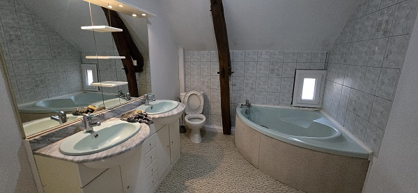 A l'étage : palier, trois chambres dont une avec espace mezzanine au-dessus, salle de bains avec wc.